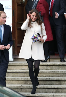 Left : Printed Erdem dress for a visit to Willows Primary School in Manchester. Right : Cream and white coat from Goat with Topshop peter pan collared dress for a visit to the offices of Child Bereavement UK charity.